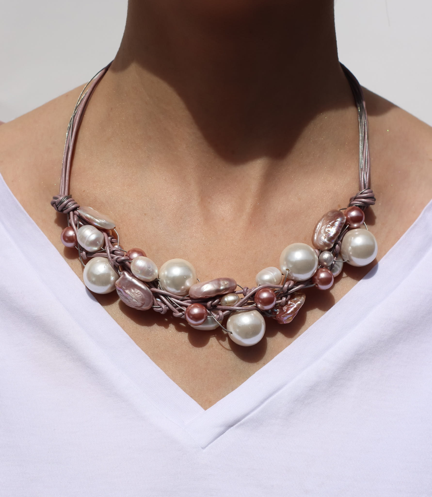 Sieć Perłowa w odcieniach różu i bieli wykonana z pereł hodowanych i pereł majorka zaplecionych na srebrnej lince jubilerskiej i rzemieniu w kolorze jasnego różu.