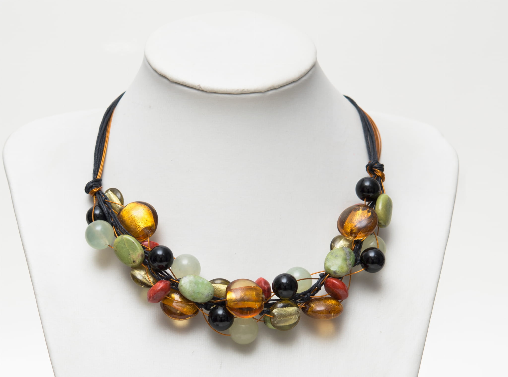 Sieć Klasyczna w odcieniach oliwkowej zieleni, czerni, złota i rudego to naszyjnik wykonany z kamieni półszlachetnych (koralowiec, onyks, jaspis, jadeit, agat) i szkła weneckiego. Wszystko zaplecione na złotej lince jubilerskiej i cienkim czarnym sznurku.