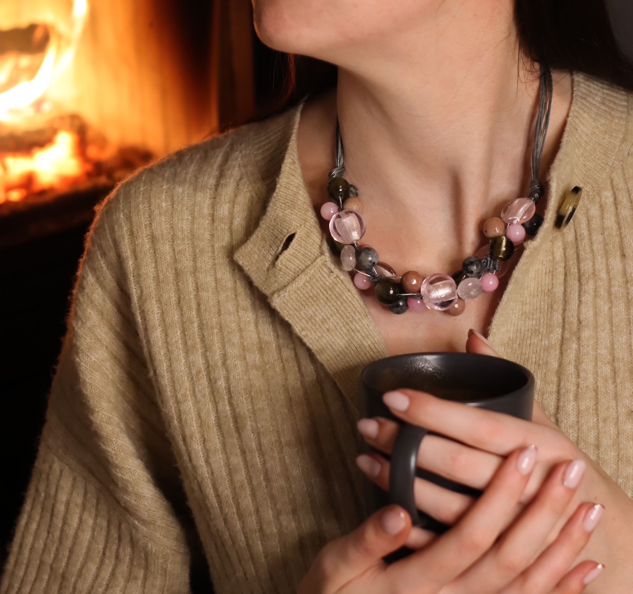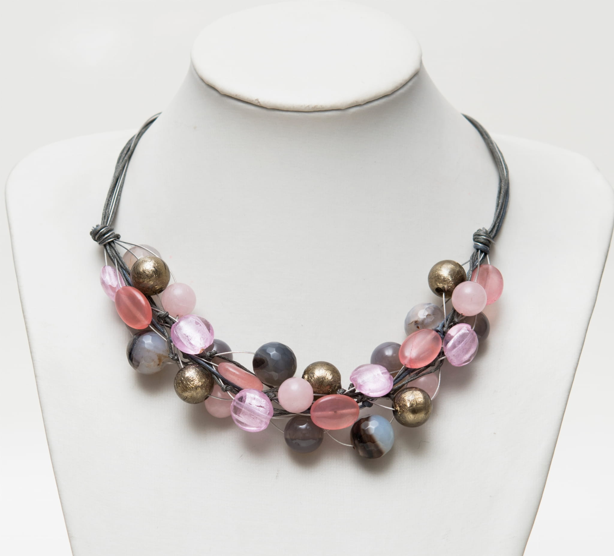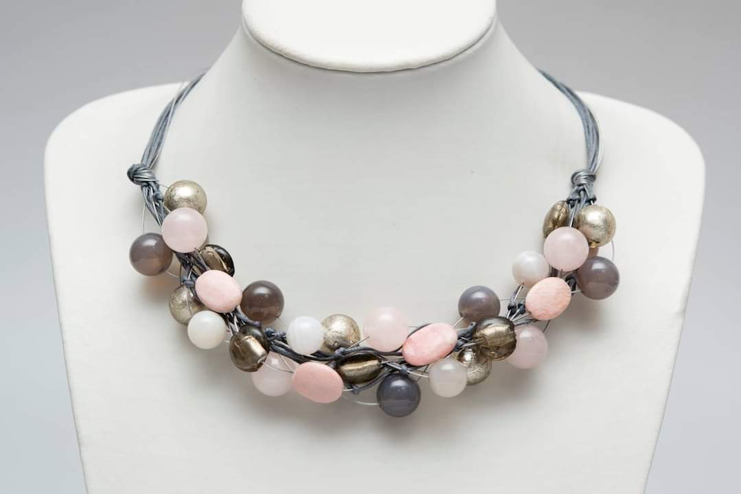 Ręcznie wykonany naszyjnik Sieć o odcieniach różu i szarości z kamieni półszlachetnych (kwarc różowy, agat, jaspis, jadeit) i szkła weneckiego.