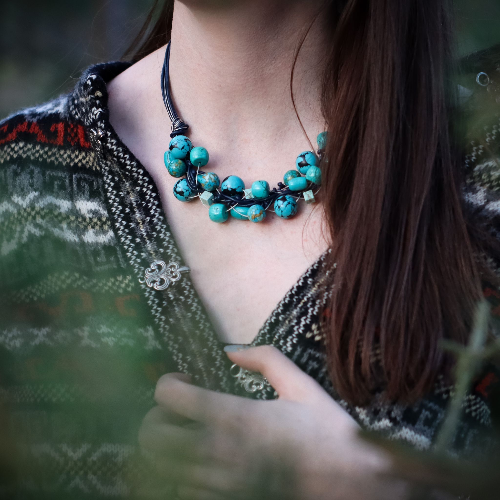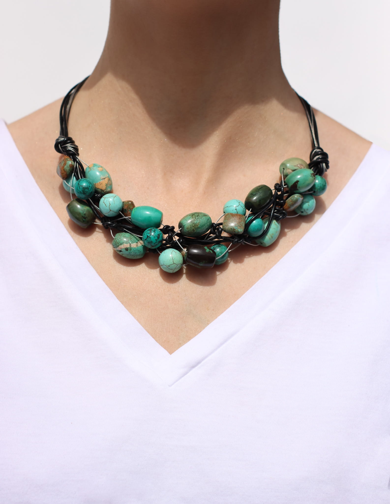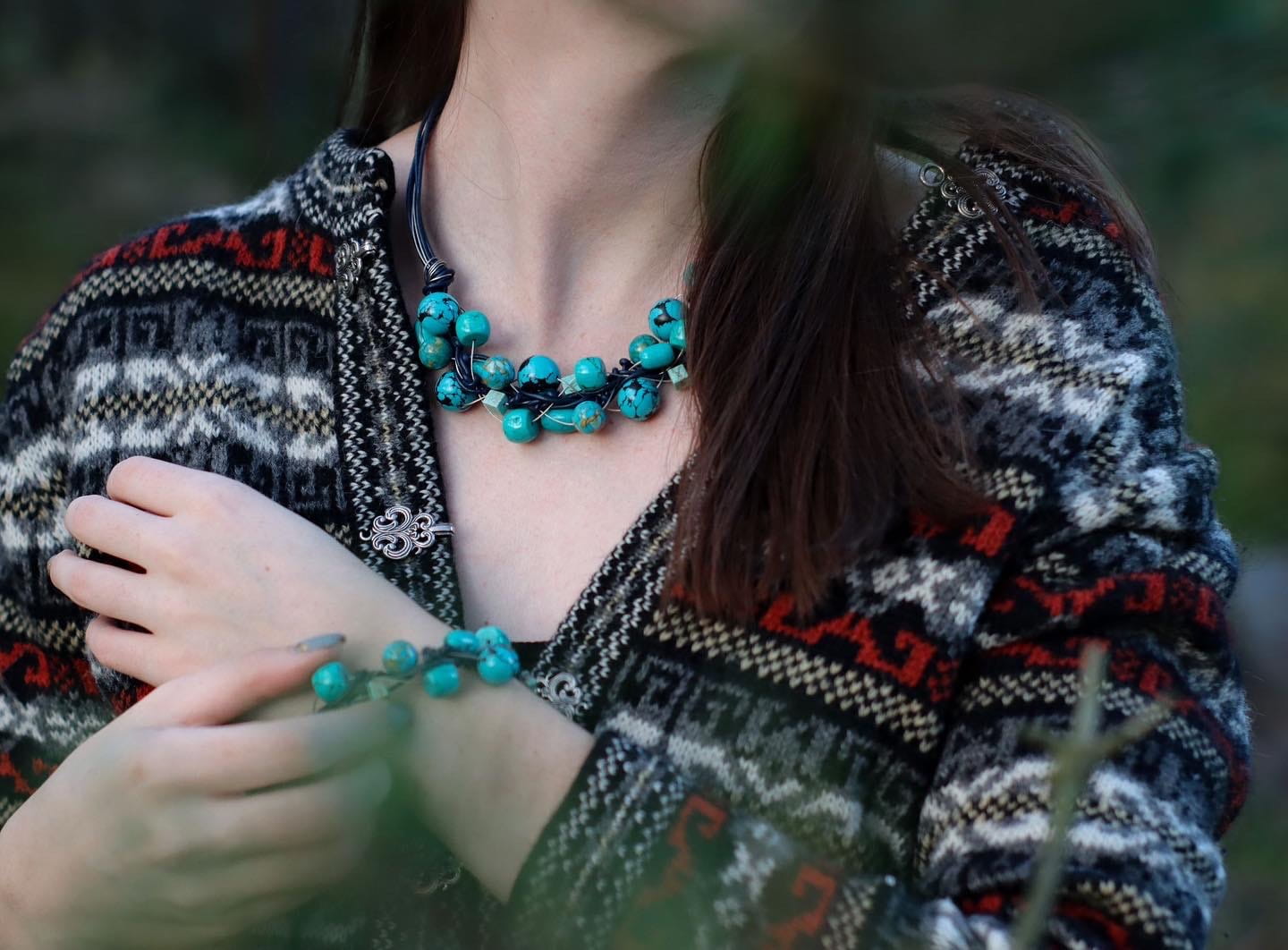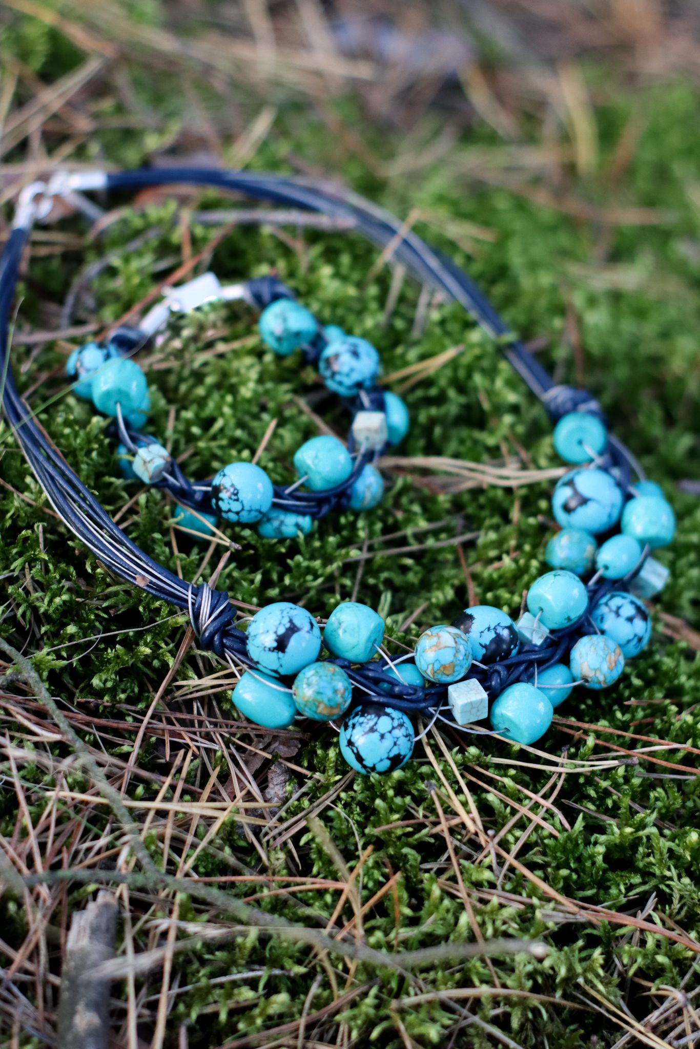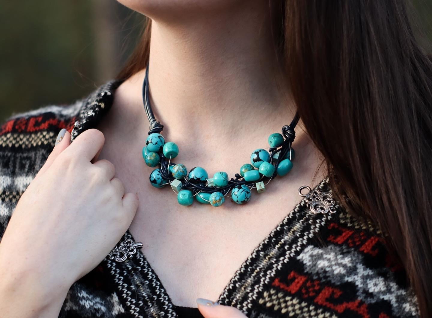 Sieć Exclusive z turkusów, linki jubilerskiej i rzemienia.