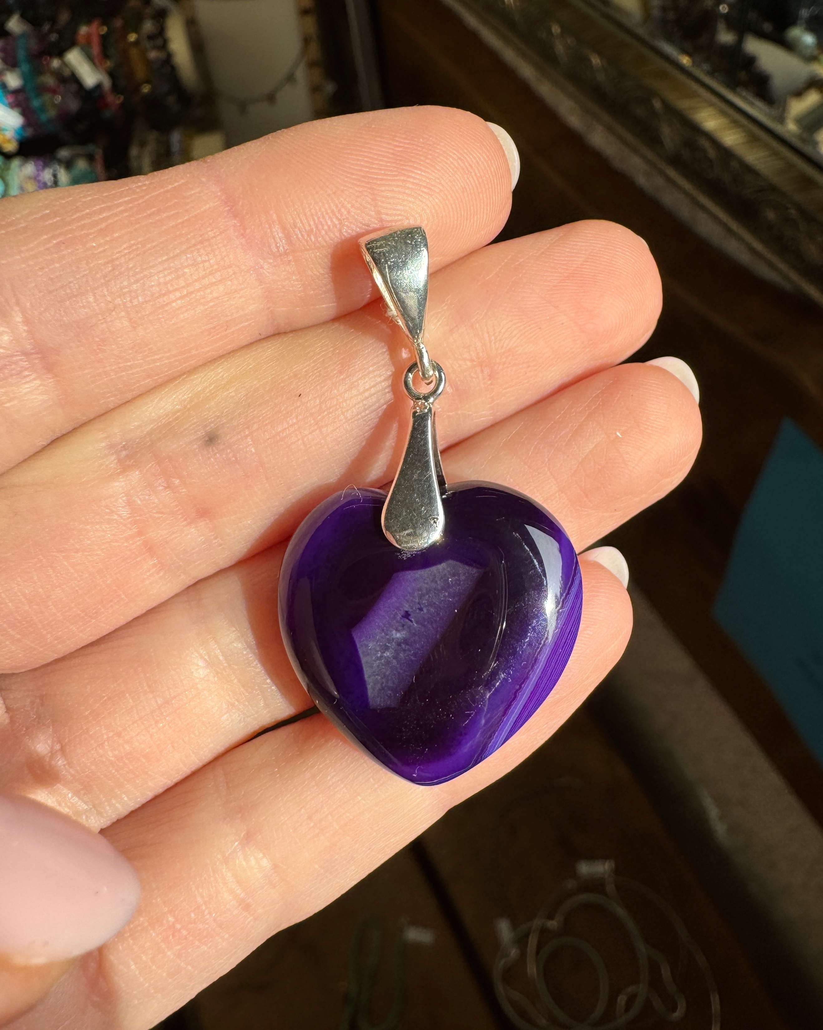 Piękny ręcznie robiony wisior z fioletowego agatu w kształcie serca i srebra pr.925