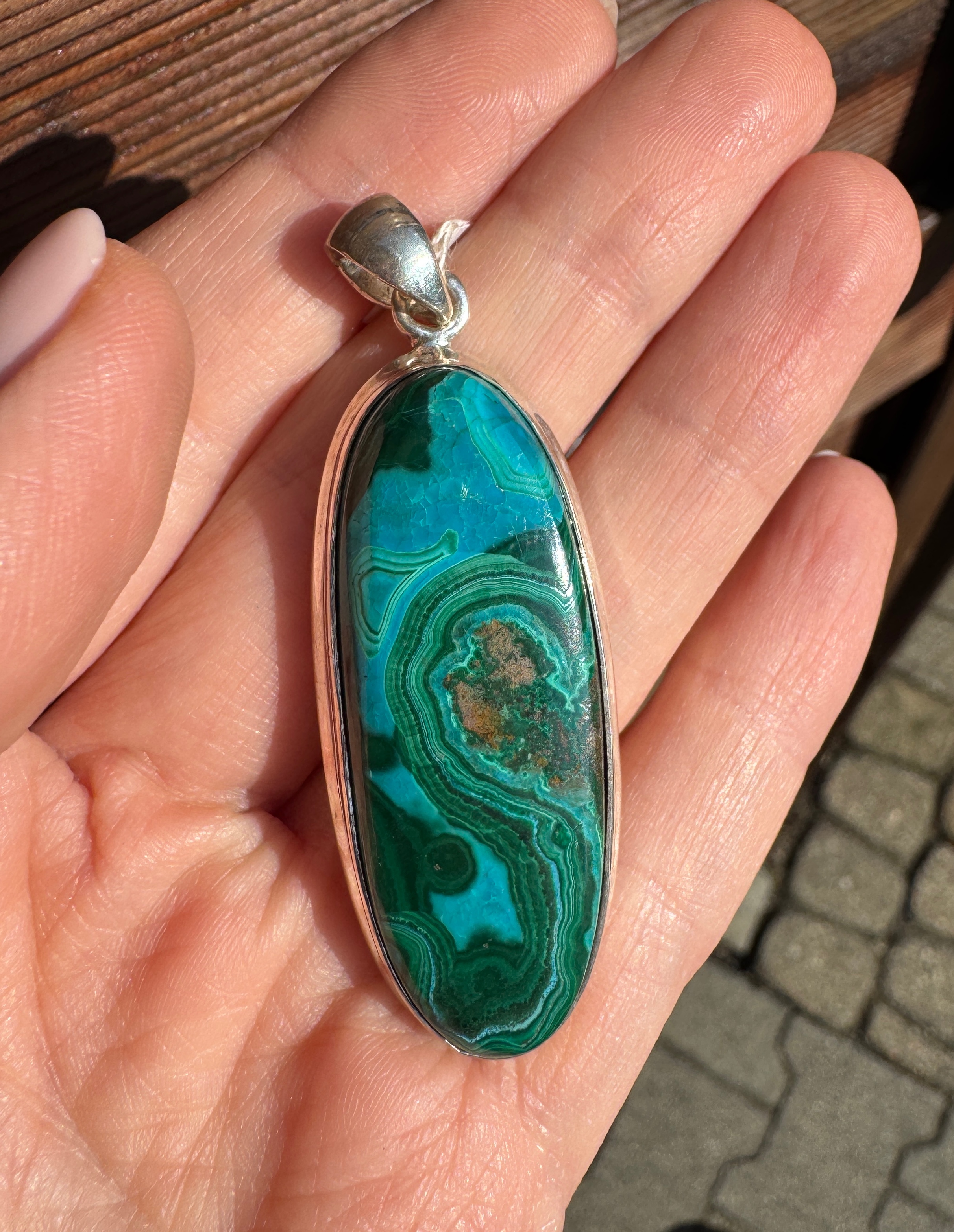 Wisior z pięknej chryzokoli z malachitem i srebra pr. 925.