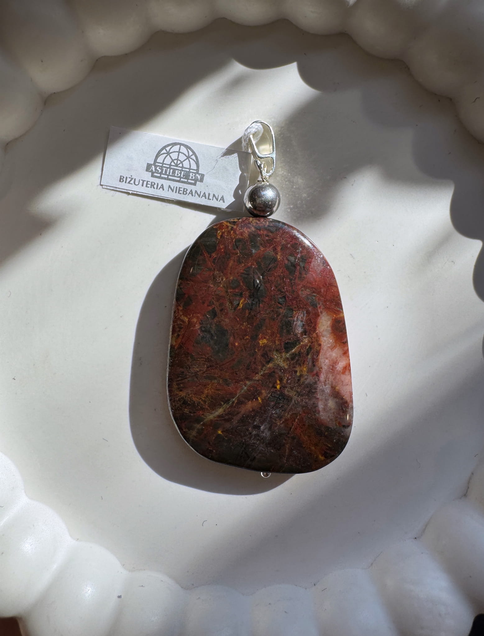 Wisior z jaspisu w odcieniu brązu, rudego i czarnego oraz srebra pr. 925.