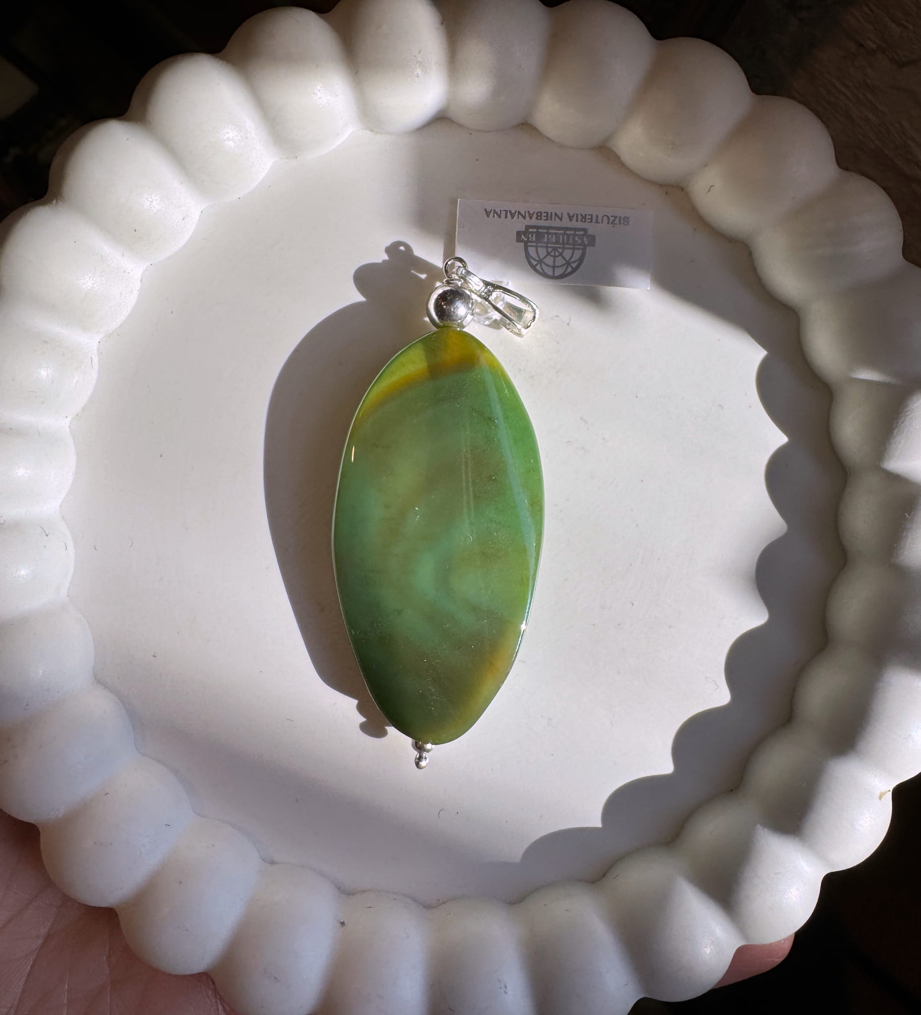Wisior z agatu w odcieniu wiosennej zieleni pięknego i niepowtarzalnego i srebra pr. 925.