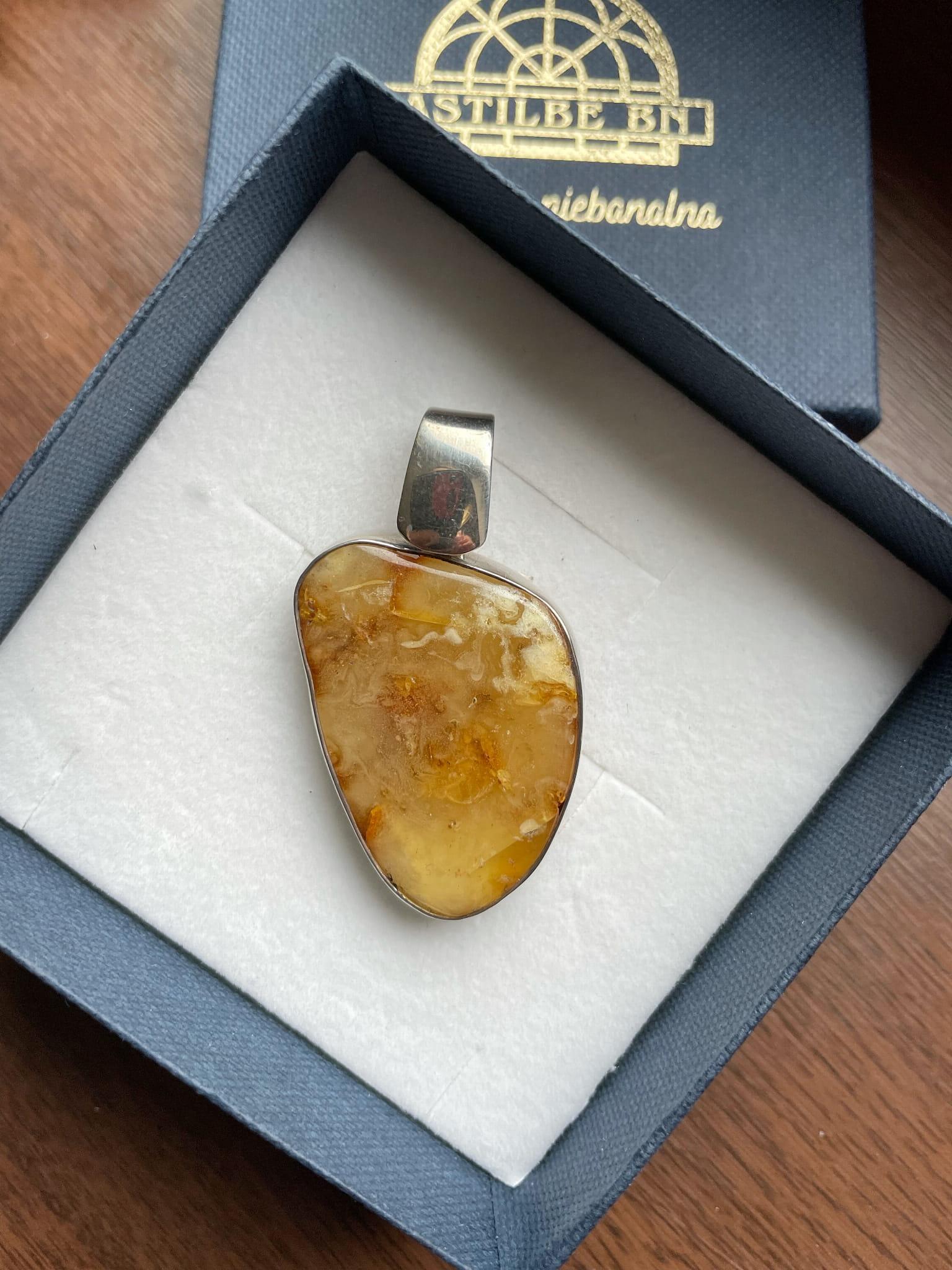 Piękny i niepowtarzalny ręcznie robiony wisior z naturalnego bursztynu i srebra pr.925