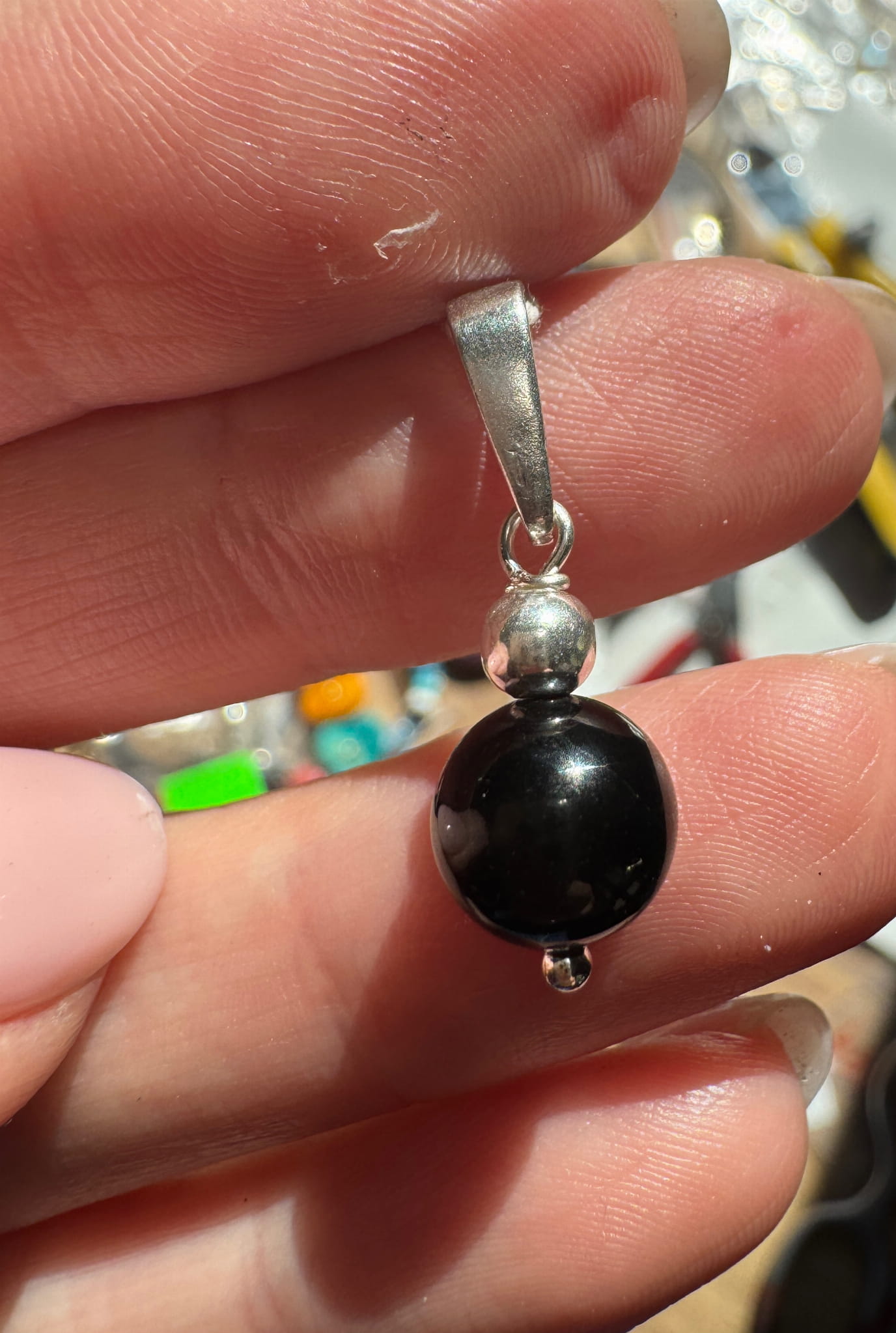 Piękny Wisior z kulki turmalinu czarnego i srebra pr. 925.
