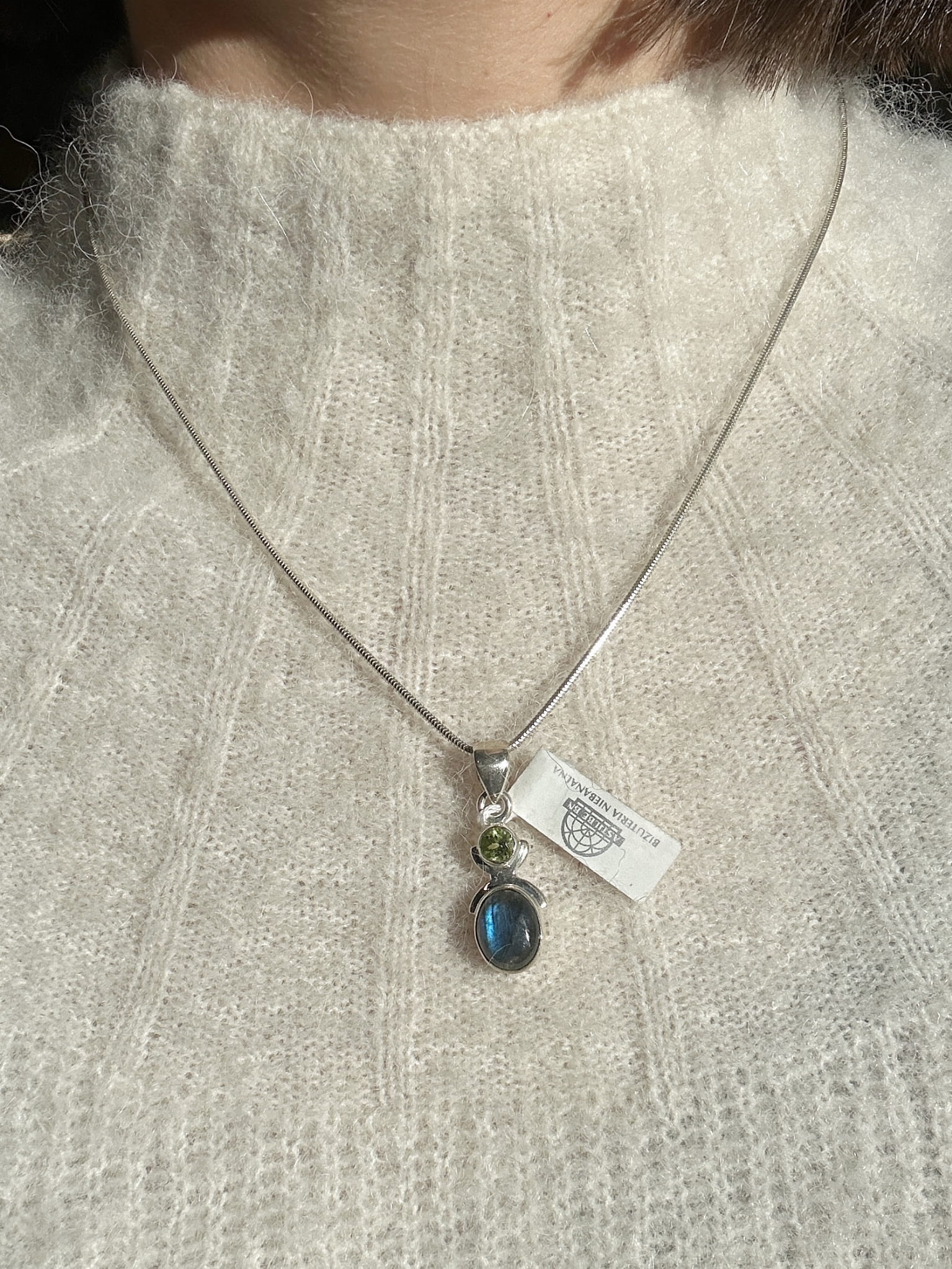 Piękny Wisior z labradorytu i fasetowanego oliwinu i srebra pr. 925.