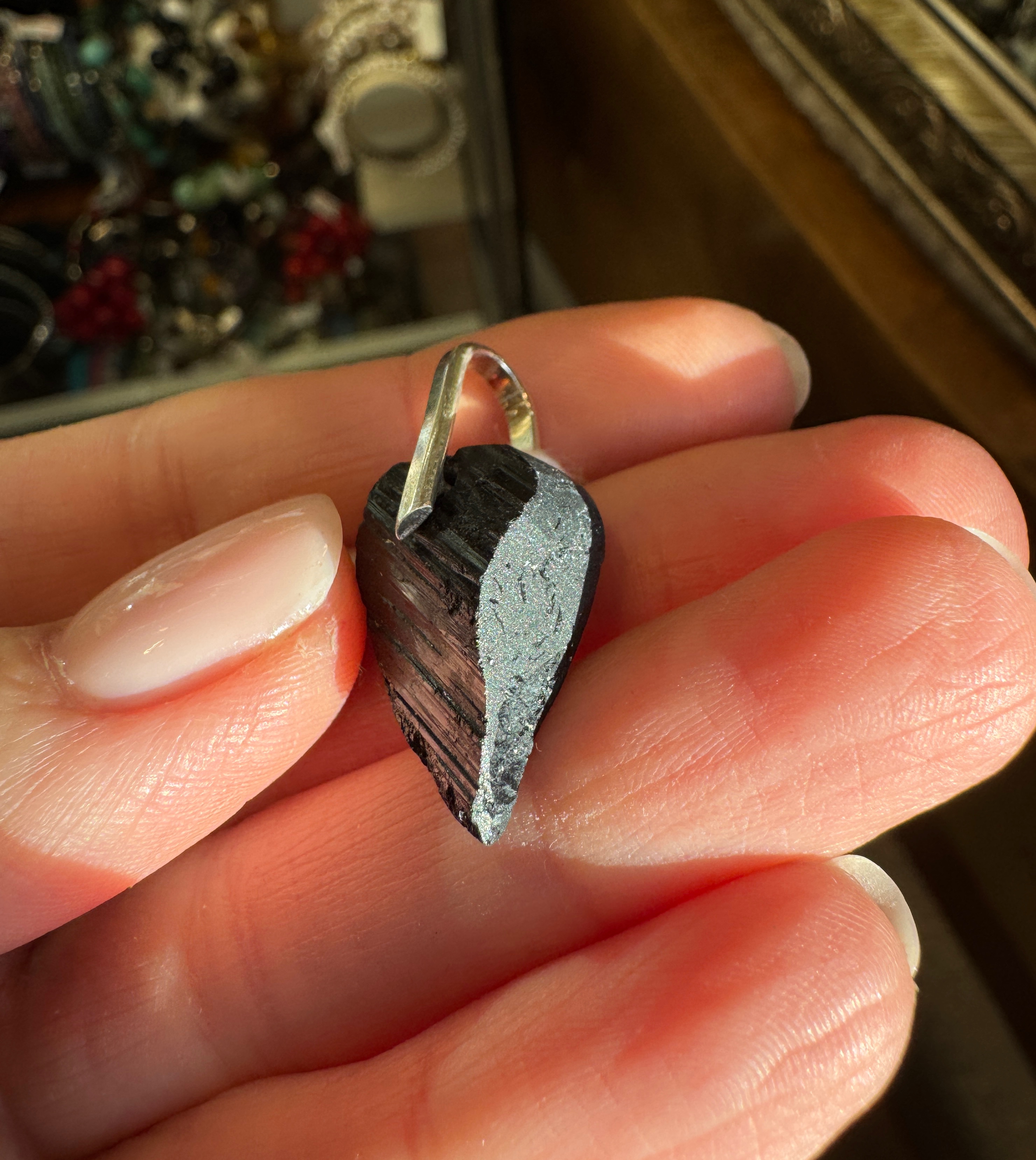 Piękny Wisior z surowego turmalinu czarnego i srebra pr. 925.