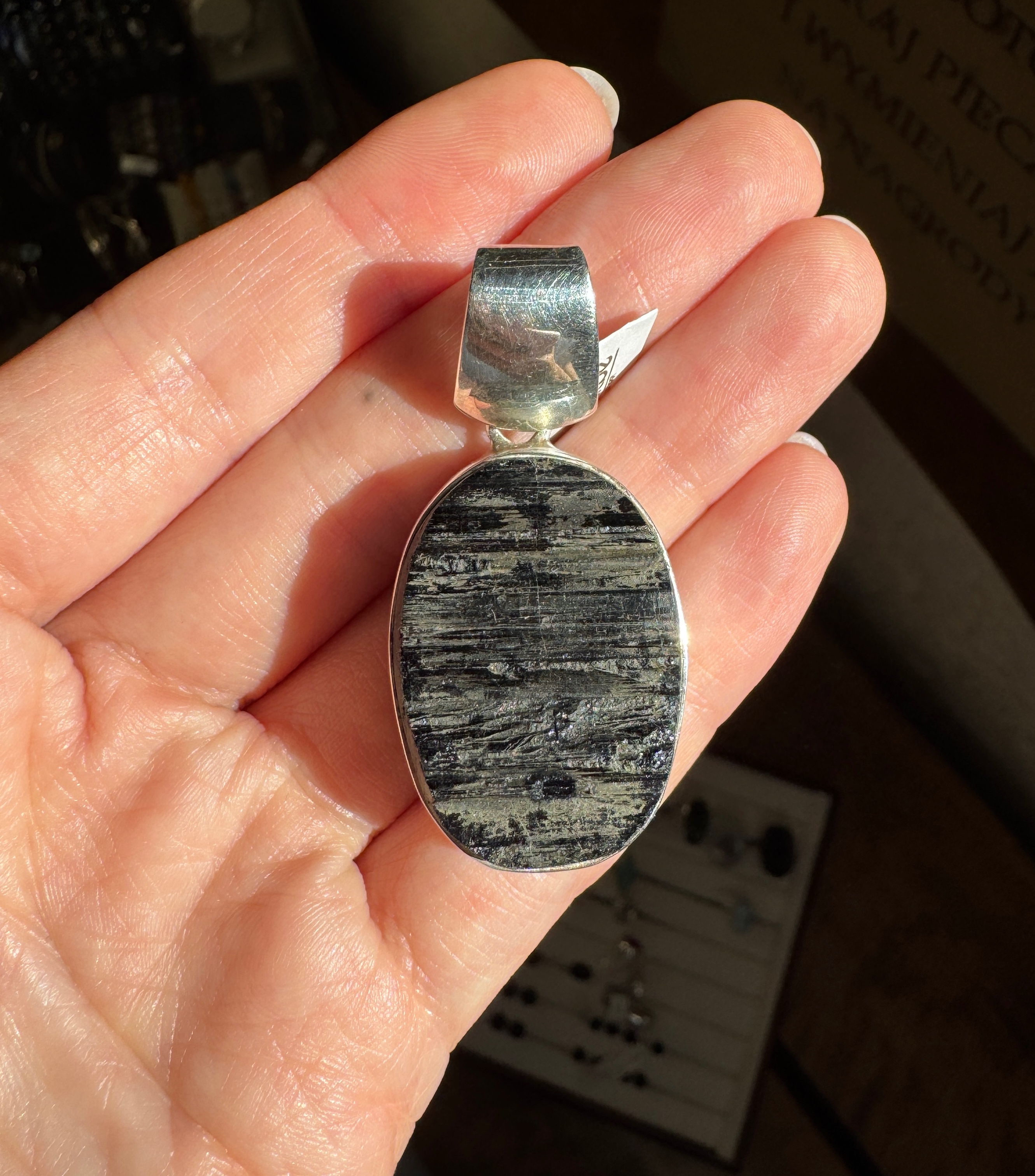 Piękny Wisior z surowego turmalinu czarnego i srebra pr. 925.