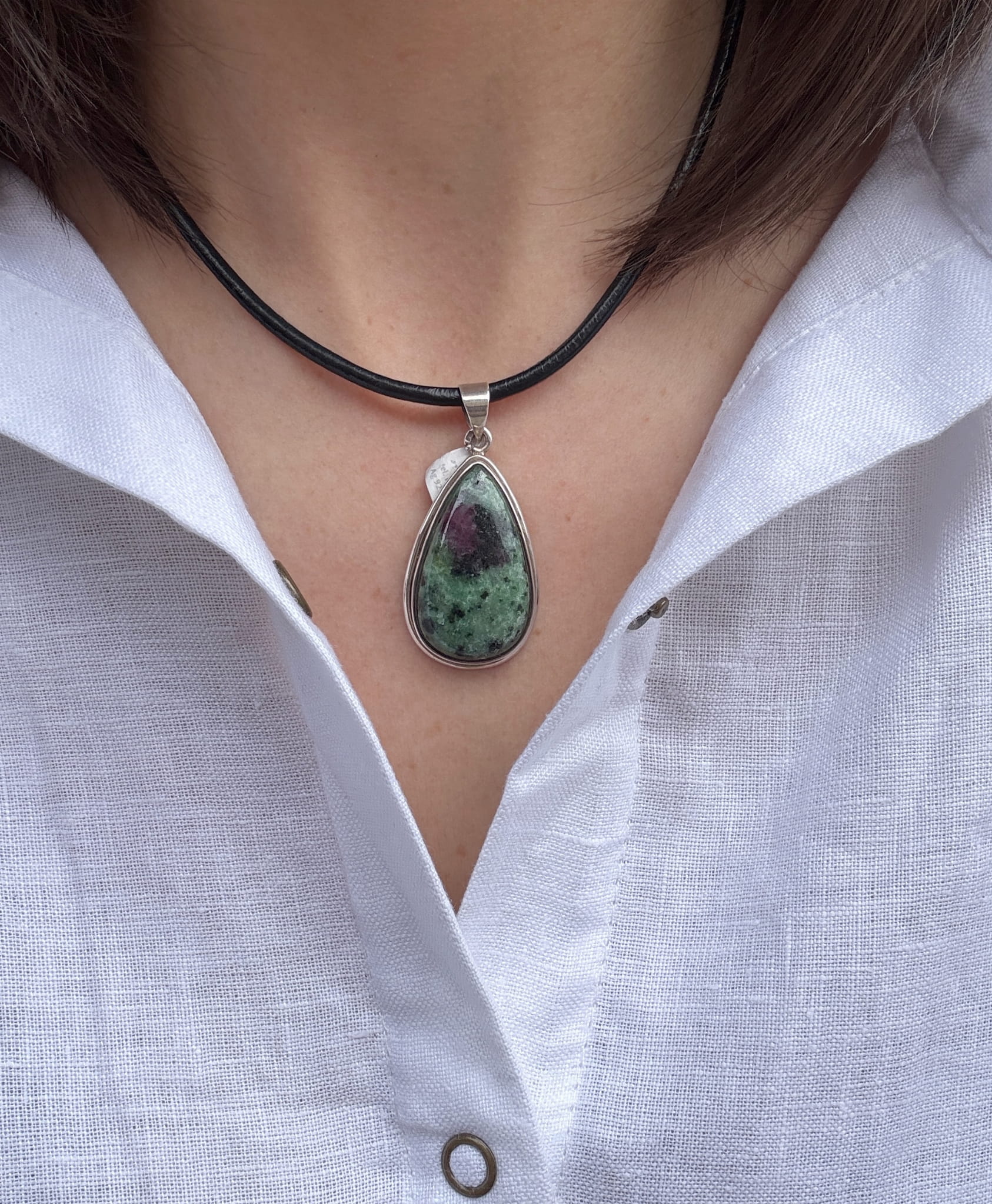 Wisior zoisyt z rubinem łezka