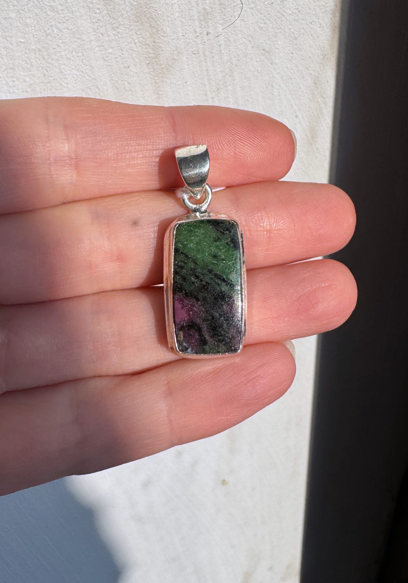 Wisior z zoisytu z rubinem i srebra pr. 925.