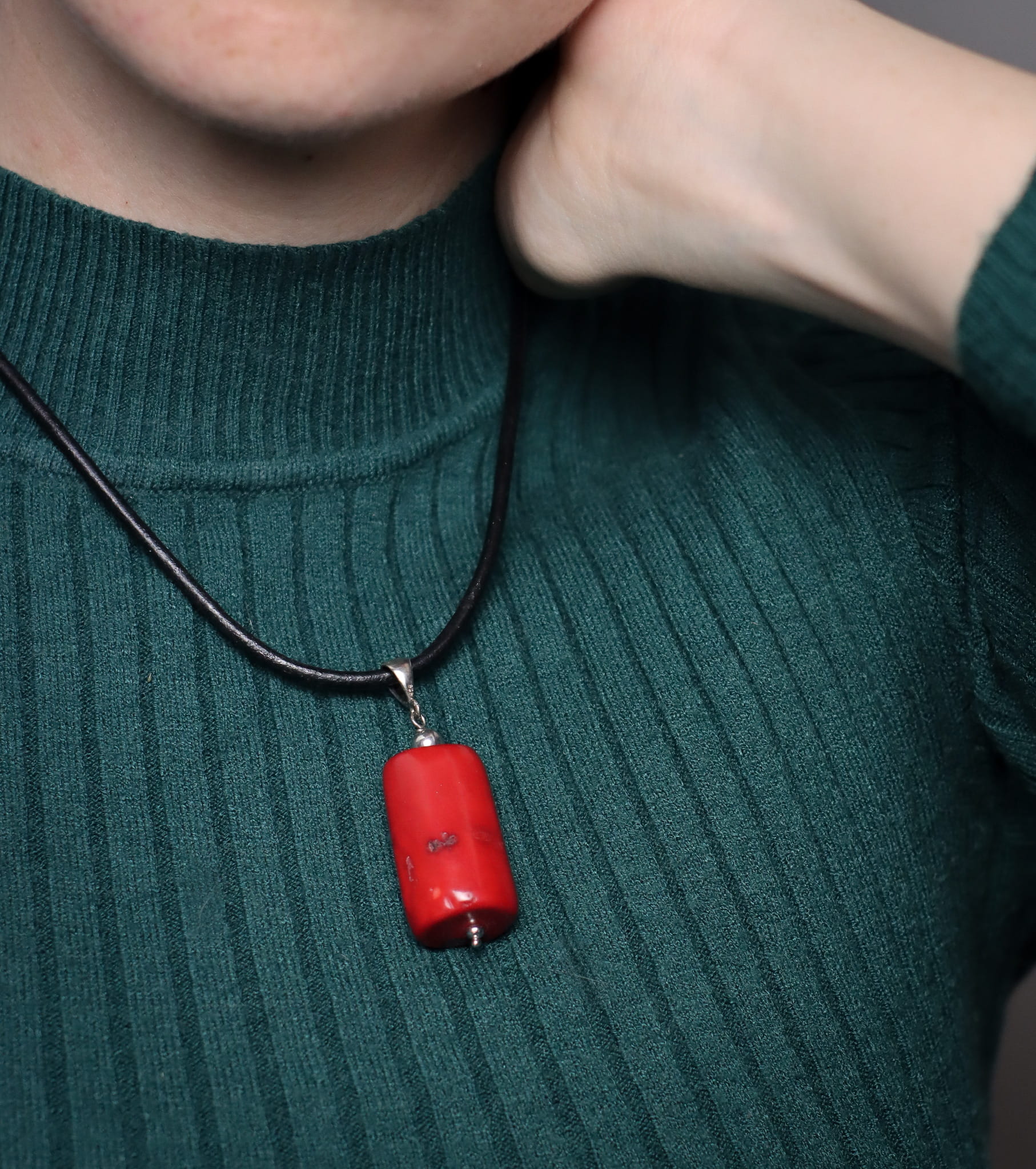 Naszyjnik ręcznie wykonany z czerwonego korala w kształcie walka, srebra pr.925 oraz rzemienia w czarnym kolorze.