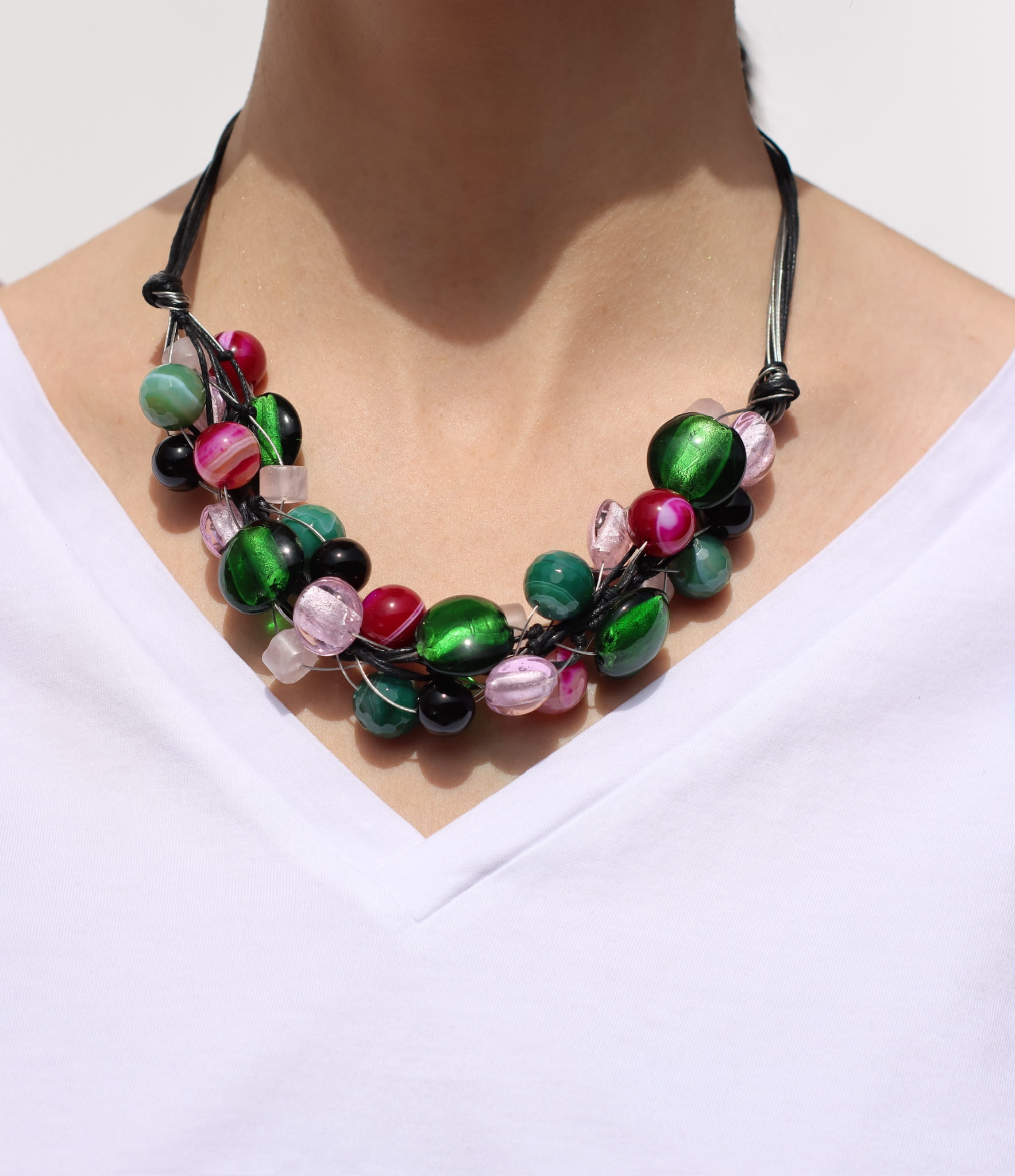 Kolorowy naszyjnik Sieć Klasyczna ręcznie wykonany z kamieni półszlachetnych (agat purpurowy, koral zielony, jadeit, onyks) i szkła weneckiego.